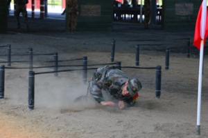 ④穿越火线:参赛选手需携带“炸药包”依次匍匐通过绳网(低桩网)和障碍(独木桥)区前行至“敌军炮楼”,将炸药包安放在“敌军炮楼”下后,返回出发点,下一名选手接力完成任务,以此类推。按团队完成时间计算名次,如未走完独木桥则罚时1分钟。