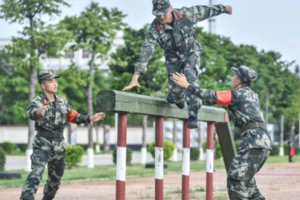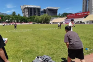 ⑥手榴弹投掷:所有参赛选手站到指定区域开始投掷,不允许越线等违规行为。场地内地面上画有五个靶位,每个靶位5—10环,参赛选手需将手榴弹投掷到15米外的靶位中,走过独木桥返回起点下一名选手接力完成任务,以此类推。根据环数比分统计排名,环数相等按完成时间排名,如未走完独木桥则取消该选手该项目成绩。